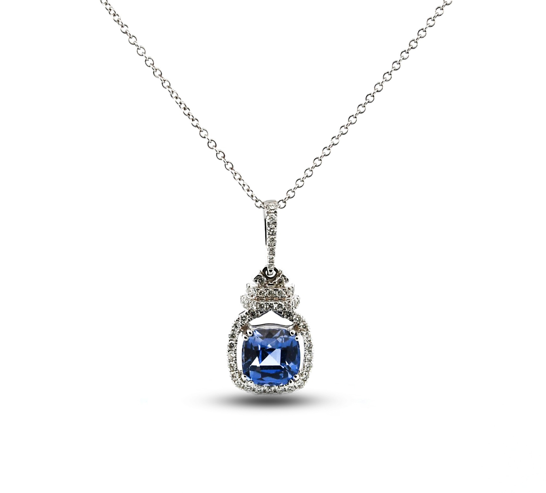 14k white gold blue sapphire and diamond necklace. The cushion blue sapphire is 1.75ct. There are 52 round diamonds weighing 0.23ct total weight of G-H color and SI1 clarity. The pendant sits on an 18″ 1.1mm cable chain.