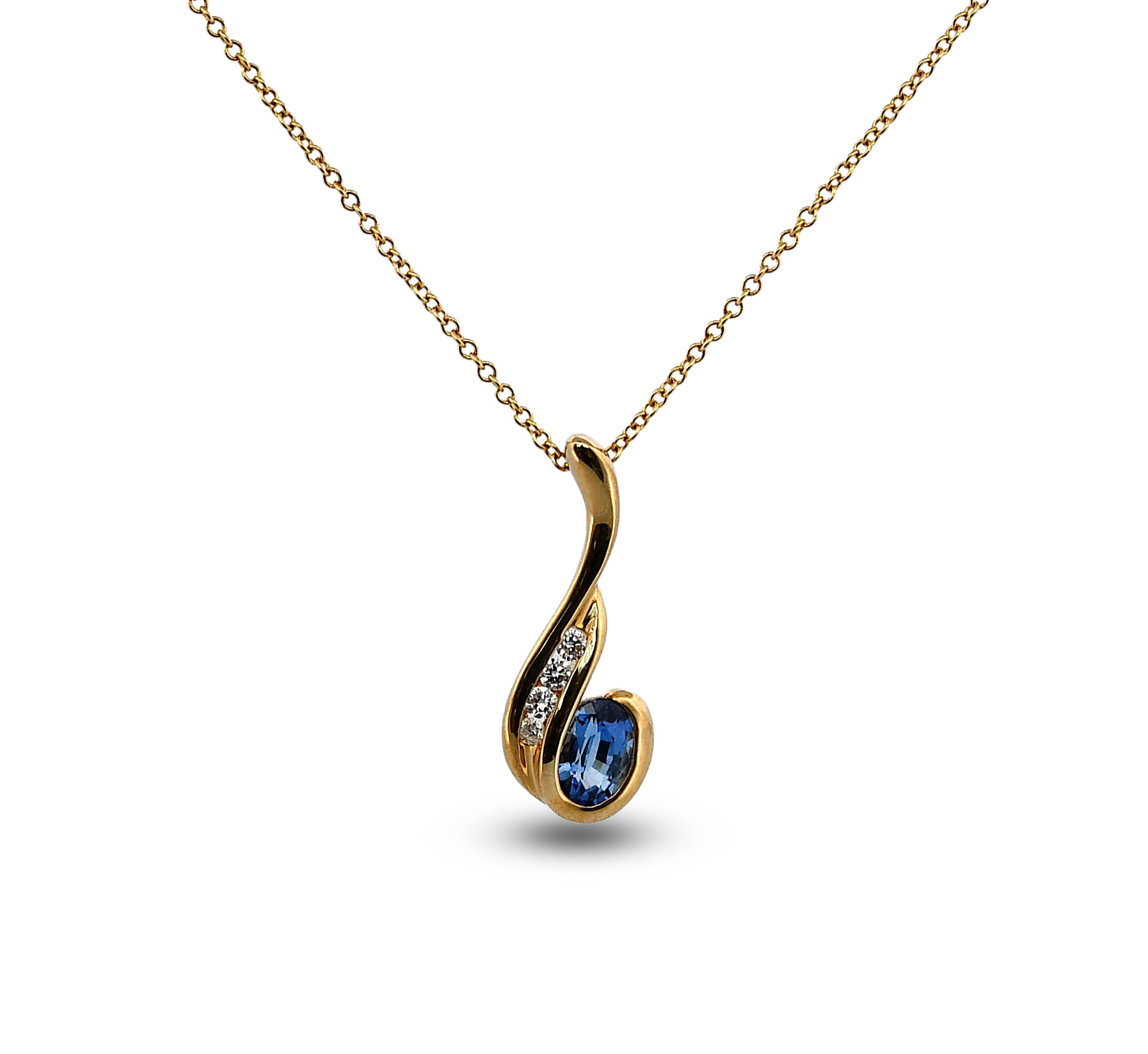 14k yellow gold blue sapphire and diamond pendant on an 18″ 1.1mm cable chain. The oval sapphire is 0.58ct. There are 4 round diamonds weighing 0.06ctw of G-H color and SI clarity.